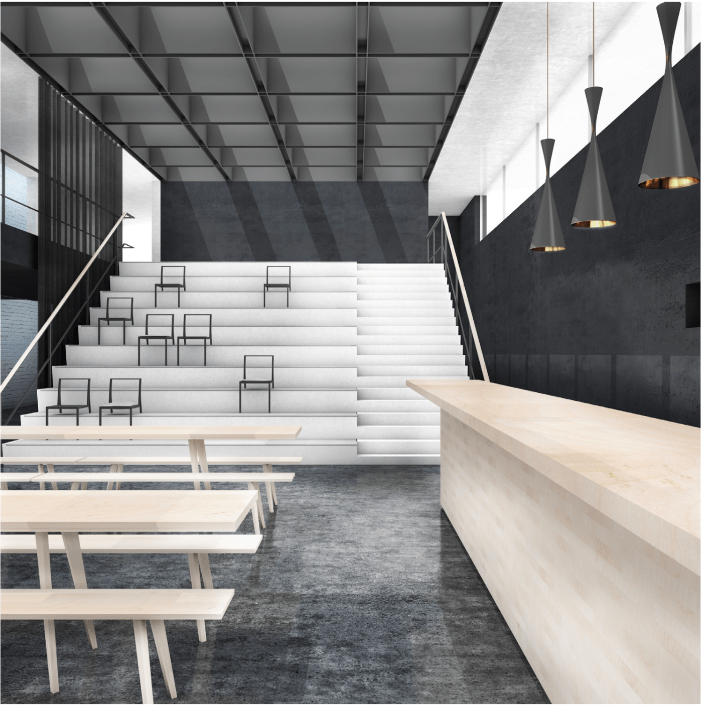 Dat resulteerde uiteindelijk tot het slopen van het oude entreegebouw en het herstructureren van het bestaande gebouw. Tussen de voormalige gymzaal en het hoofdgebouw heb ik een nieuwe ontsluiting ontworpen, bereikbaar vanuit het souterrain. Een centrale gemeenschappelijke ruimte, wat de verschillende functies als muziek-school, theater en sportaccommodatie ontsluit. Deze gemeenschappelijke ruimte heeft een bar voor gelegenheden en kan afgesloten worden met een gordijn om de ruimte af te bakenen voor muziek/theater voorstellingen.
